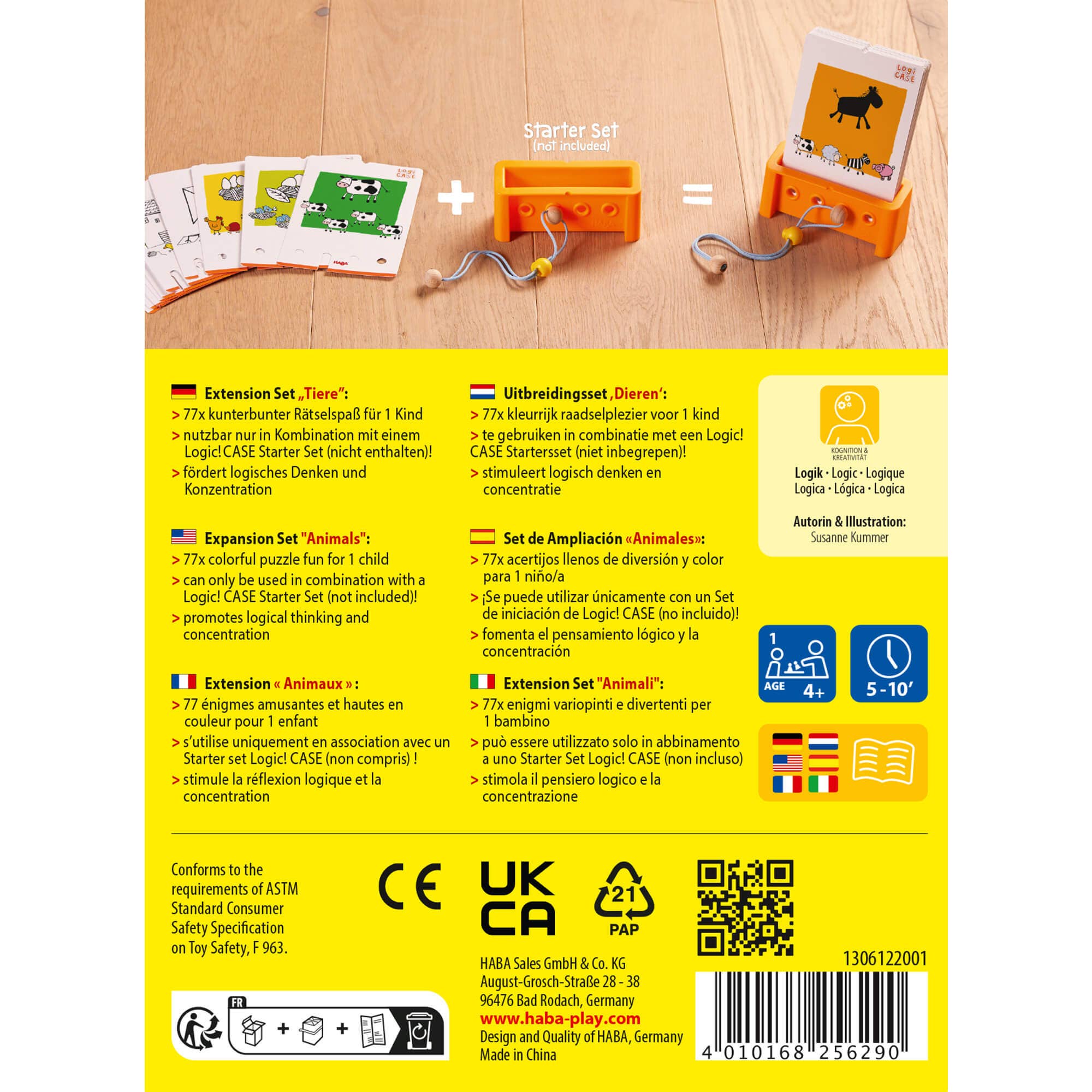 Appeal to young puzzle enthusiasts with HABA's Logic! CASE Extension Set 4+ Animals, designed for children aged 4 and up. This vibrant and challenging puzzle set complements the Logic! CASE series, offering colorful tasks that engage young minds in logical thinking and problem-solving. * Interactive Learning: Contains 40 puzzle cards with 77 unique puzzles, encouraging children to decipher and solve diverse challenges. * Self-Check Mechanism: Kids use the wooden pencil to verify their solutions, promoting independence and boosting confidence in problem-solving skills. * Flexible Gameplay: Perfect as a travel game, allowing children to enjoy educational fun on the go.